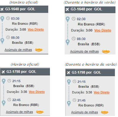 Por exemplo, o estado do Acre não participa da mudança de horário, ao contrário de Brasília. Na compra de uma passagem para esse trecho, o site da companhia já irá apresentar os dados do voo com os horários ajustados de acordo com cada estado (veja as imagens abaixo), assim como nos bilhetes emitidos.