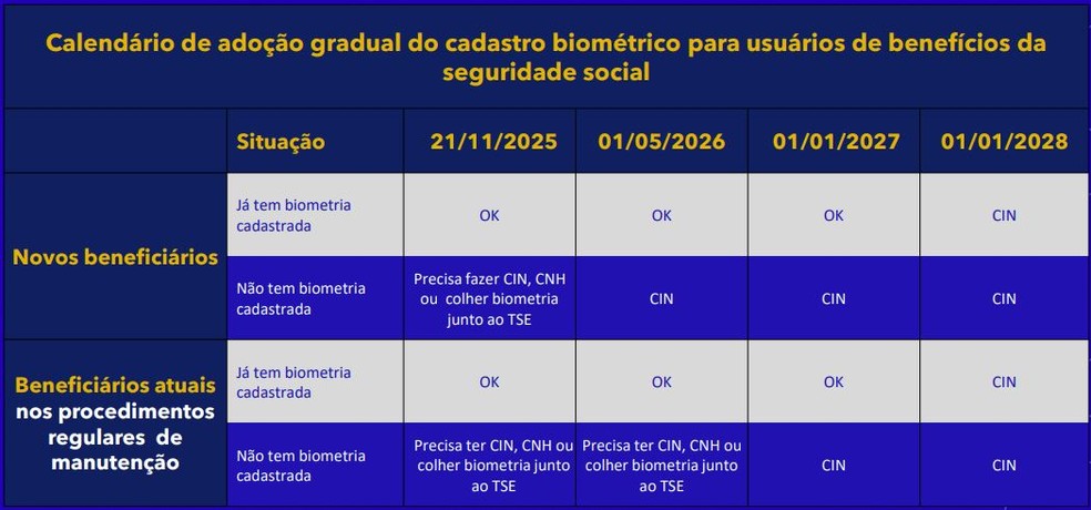 * 1º de maio de 2026: Para quem já tem biometria cadastrada em alguma base, nada muda e esse cadastro continua válido para novos pedidos e renovação. Quem não tem biometria cadastrada e for pedir um novo benefício, precisará ter a CIN a partir dessa data.