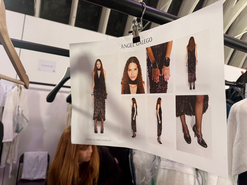 No desfile da Burberry, Angel entrou na passarela com um vestido preto de silhueta alongada, decote profundo em V e amarração no pescoço. A peça trazia saia texturizada com franjas delicadas, criando movimento a cada passo. O look foi combinado com meia-calça translúcida e sapatos de salto com tira no tornozelo, dentro da estética sofisticada apresentada pela marca.