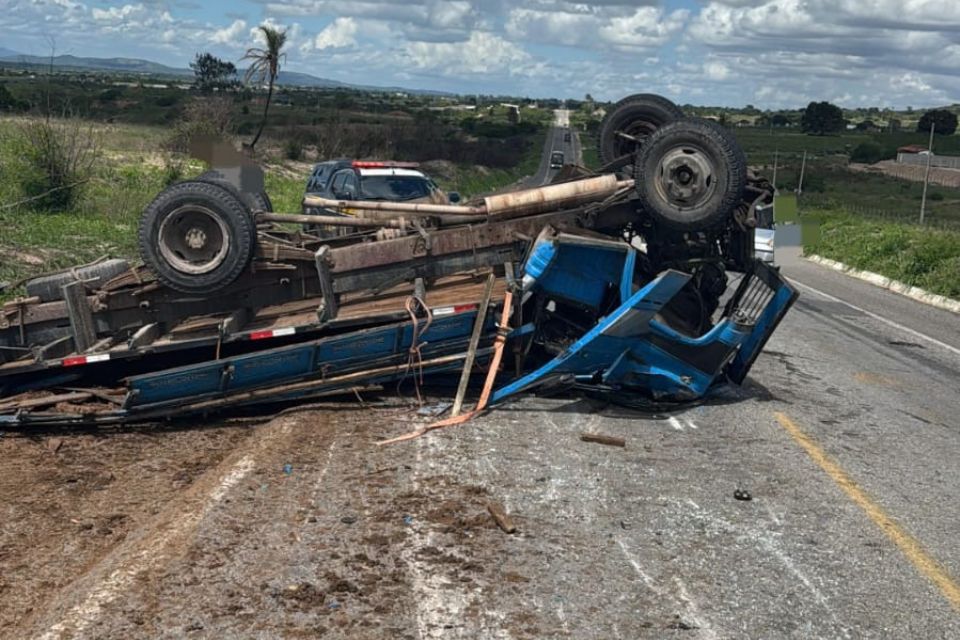 Segundo a PRF, o veículo seguia pela rodovia quando um dos pneus traseiros estourou. O condutor perdeu o controle da direção e o caminhão acabou capotando.