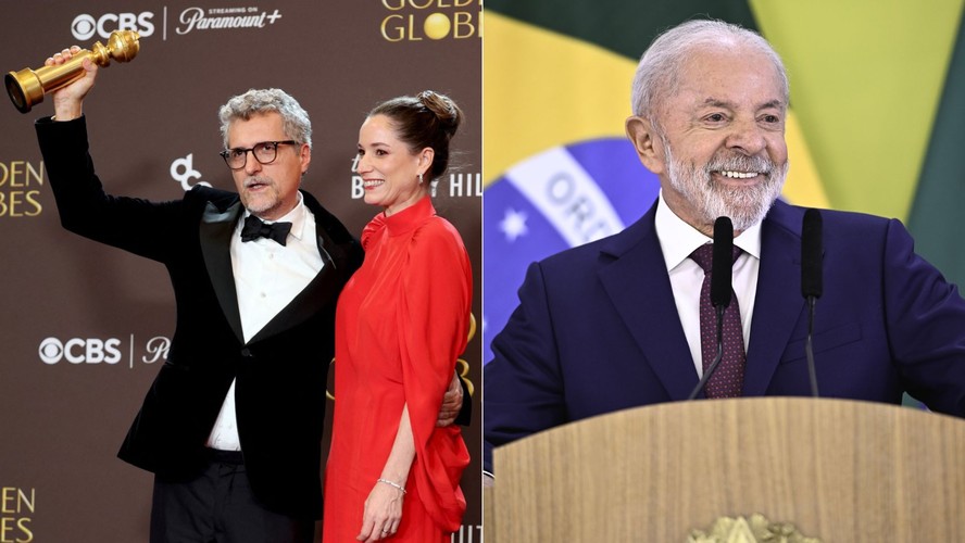 O presidente Lula parabenizou a equipe de 'O Agente Secreto' pela vitória no Globo de Ouro 2026. — Foto: AMY SUSSMAN / GETTY IMAGES NORTH AMERICA / GETTY IMAGES VIA AFP e Ton Molina/Fotoarena/Agência O Globo